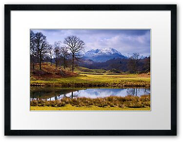 A Lake District landscape photo of the River Brathay with a snow-topped Wetherlam in the background.(Mono version also available)