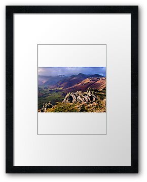 A Lake District landscape photo of Great Langdale. Taken on a day of sunshine and showers, this shot was taken from Blea Rigg, and features the Langdale Pikes in the background.