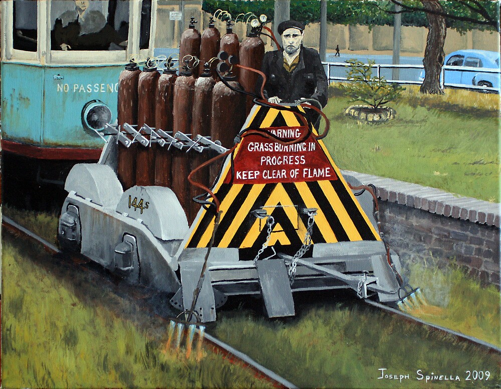 The painting dipicts this tram on weed burning duties at the Randwick racecourse tramway platform also known as the dive. The weedburning is being propelled by a D class Scrubber tram.